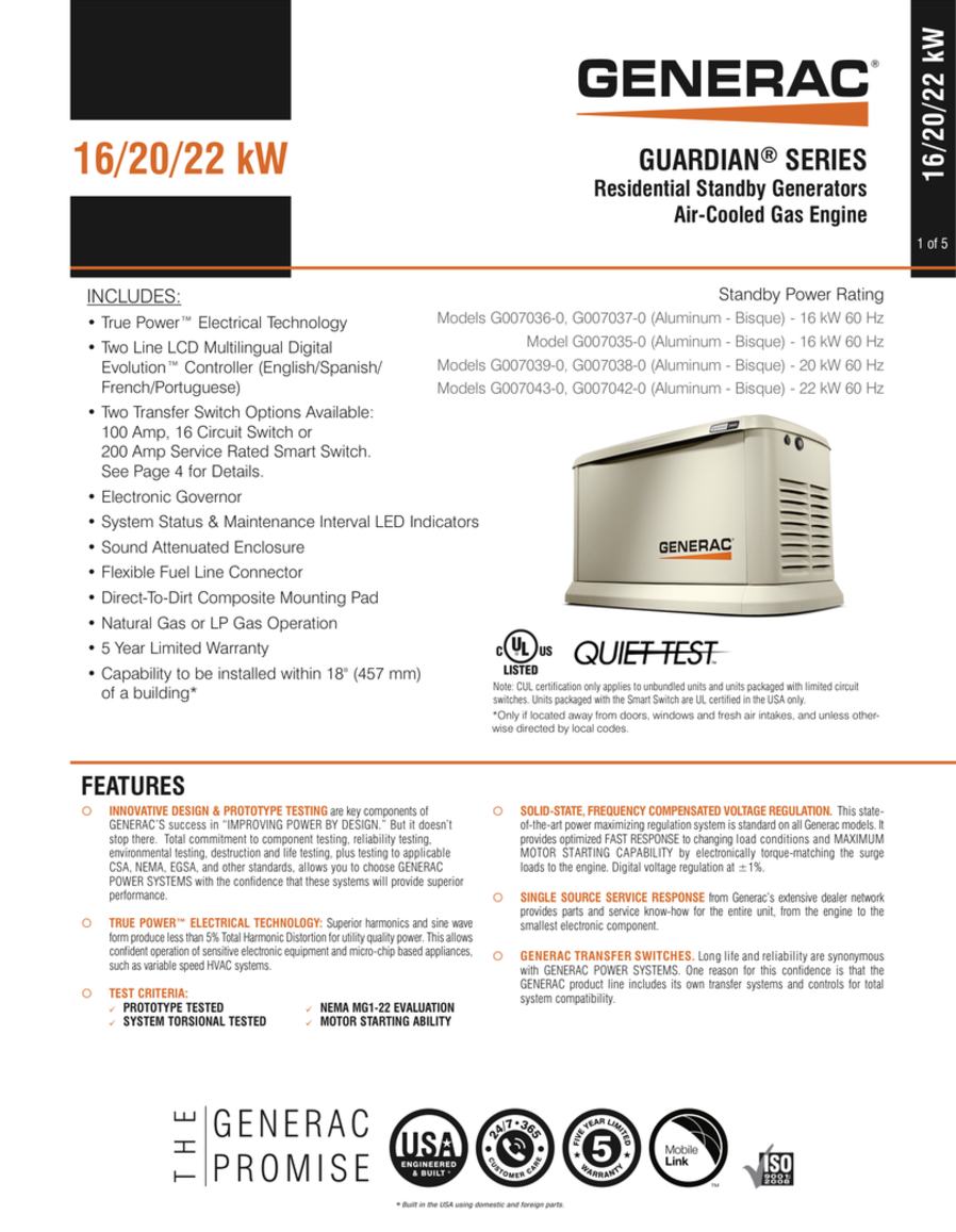 Web generac generators and engines are engineered and built in the usa* *assembled in the usa using. Web specifications (lp/ng) 10/9 kw 13/13 kw 16/16 kw 20/18 kw 22/19.5 kw generator only. Web product description reviews technical specs & downloads generac guardian 7226 18kw backup generator features: Web 2020 guardian 18kw generator features and benefits provides essential circuit power protection.