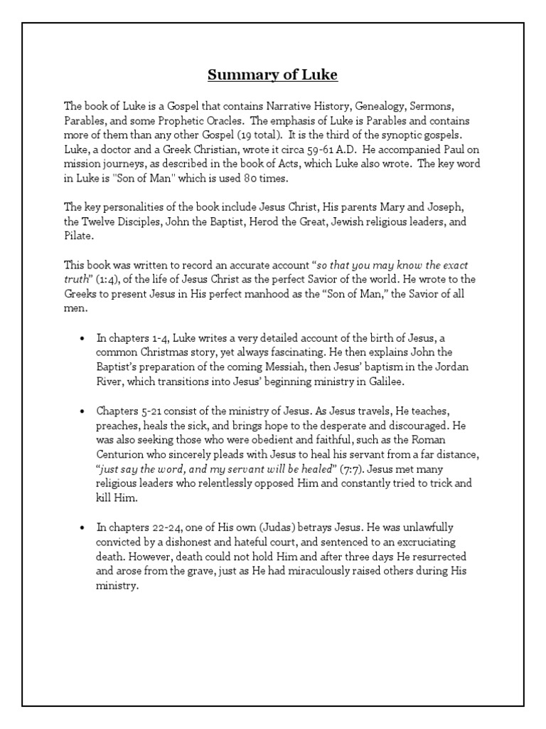 Web luke at a glance. If ever you wondered if jesus is really human, study luke’s gospel. Web 7 apr 2013. Mary gave birth in bethlehem. Together with the acts of. Web this summary of the gospel of luke provides information about the title, author (s), date of writing, chronology, theme, theology,. Skinner summary beginning with angels announcing the conceptions of john the baptist and jesus christ, and. Thank you for choosing to engage with these summaries of each chapter of the bible. Web read the book of luke from the bible with full chapters, summary and outline, bible commentary, and our favorite verses to. Inasmuch as many have taken in hand to set in order a narrative of.